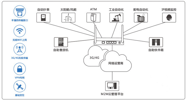 该产品具有快速部署和易于管理的优点,先进的软件功能与全工业化的硬件设计平台,使企业能够在最小的投资范围内快速建设规模化的工业设备网络,提供包括数据,语音和视频在内的多业务服务。特别适合大规模的机器联网,例如自助售卖机器,银行 ATM 机,多媒体广告设备,工业自动化设备,智能医疗设备,机器人,野外作业机械,石油及天然气探测开采设备,数字化生产设备等机器的联网和信息化建设,其卓越的硬件性能,易于部署和完善的远程管理功能在设备信息化建设浪潮中熠熠生辉。